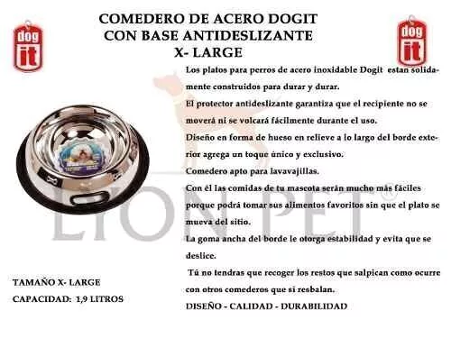 TAMAÑO X-LARGE CAPACIDAD: 1,9 LITROS Los platos para perros de acero inoxidable Dogit estan solidamente construidos para durar y durar. El protector antideslizante garantiza que el recipiente no se moverá ni se volcará fácilmente durante el uso. Diseño en forma de hueso en relieve a lo largo del borde exterior agrega un toque único y exclusivo. Comedero apto para lavavajillas. Con él las comidas de tu mascota serán mucho más fáciles porque podrá tomar sus alimentos favoritos sin que el plato se mueva del sitio. La goma ancha del borde le otorga estabilidad y evita que se deslice. Tú no tendras que recoger los restos que salpican como ocurre con otros comederos que sí resbalan. DISEÑO - CALIDAD - DURABILIDAD